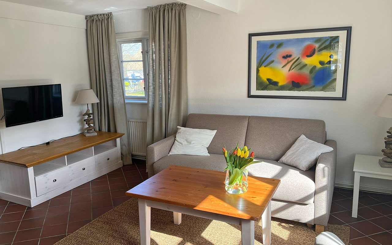 Die kuschelige Ferienwohnung Möwe im Obergeschoss bietet ca. 30 m² Wohnfläche und ist ideal für Alleinreisende oder Paare. Der besondere Höhepunkt: der schöne Blick über den Deich auf das Watt und die Nachbarinsel – perfekt für Gäste, die Nordsee-Atmosphäre direkt von der Wohnung aus erleben möchten.